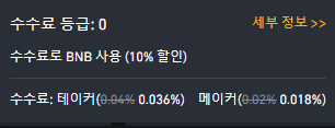 그럼 메이커 0.018%, 테이커 0.036% 이며 1에서 말한 레퍼럴 할인이 있다면 거래시에 사용한 수수료의 10%를 다시 돌려받게 됩니다.