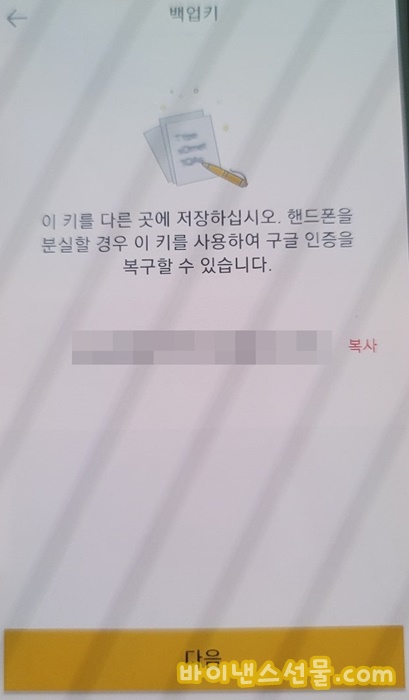 안전한 곳에 적어두시면 되구요, '복사'를 누르시고 '다음'을 누르세요.