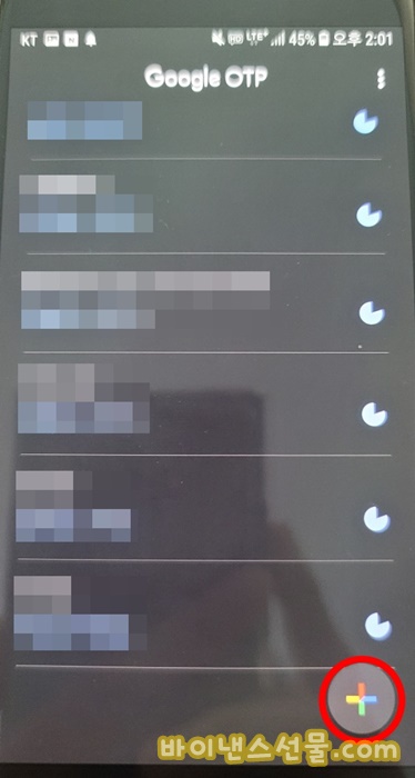 이제 그상태로 놔두고 구글OTP앱을 켜시고 오른쪽 아래의 十버튼을 누르세요.