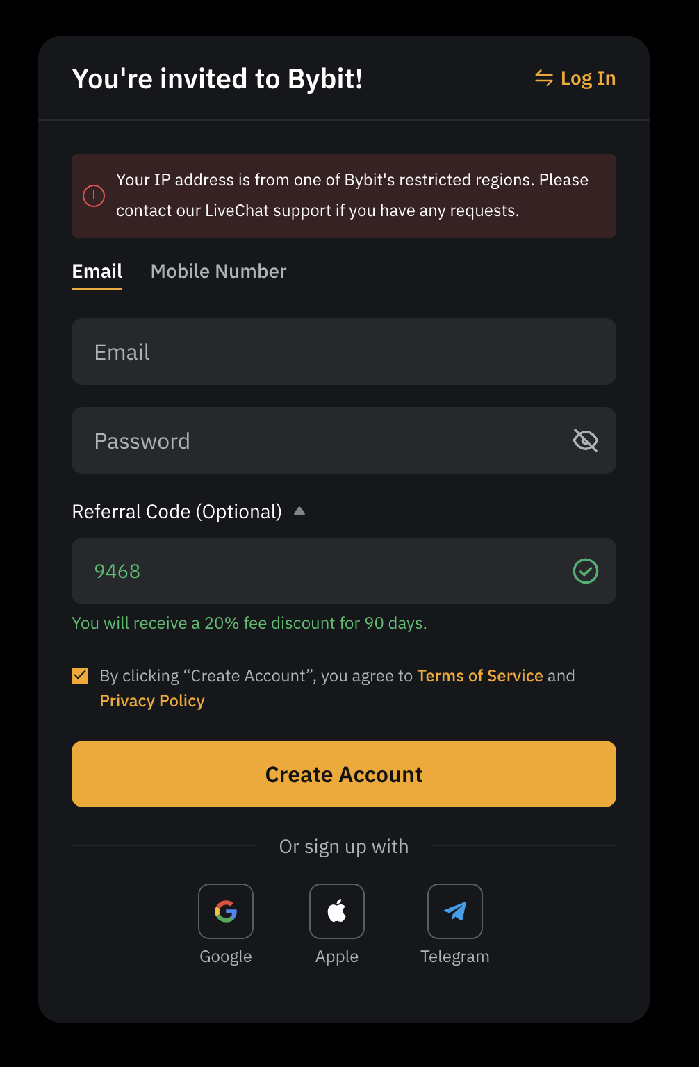 Bybit의 기본 수수료 할인은 보통 0~10% 수준입니다. 하지만 추천인 코드 9468을 사용하면: