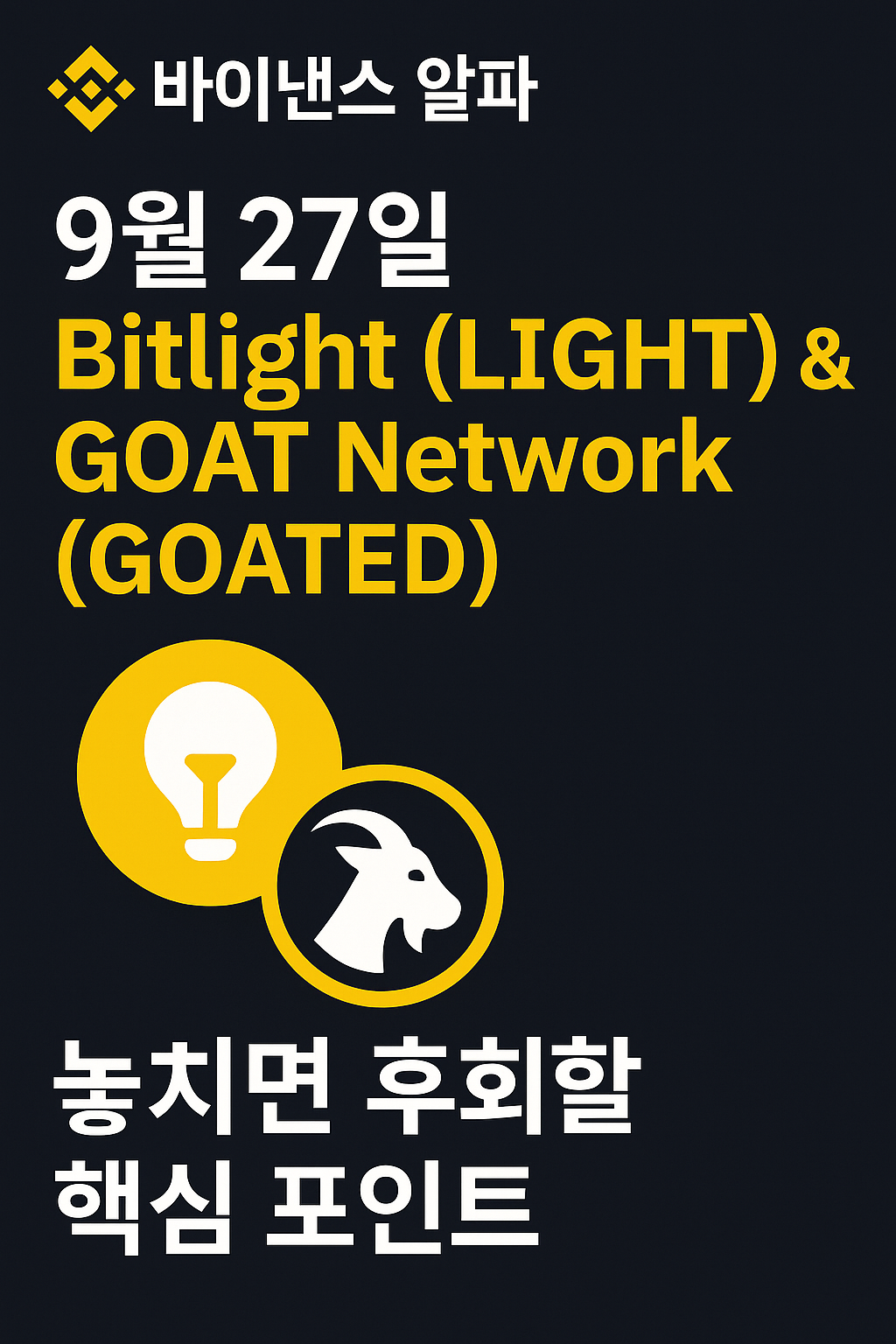 바이낸스가 X(구 트위터)를 통해 공식 발표했습니다. 2025년 9월 27일, Bitlight Labs(LIGHT) 와 GOAT Network(GOATED) 가 바이낸스 알파와 선물 마켓에 동시에 상장됩니다. 단순 상장이 아니라, RGB 프로토콜 & 라이트닝 네트워크 인프라의 핵심 프로젝트인 LIGHT의 데뷔라는 점에서 이번 이벤트는 비트코인 생태계 확장의 중요한 분기점으로 평가됩니다.