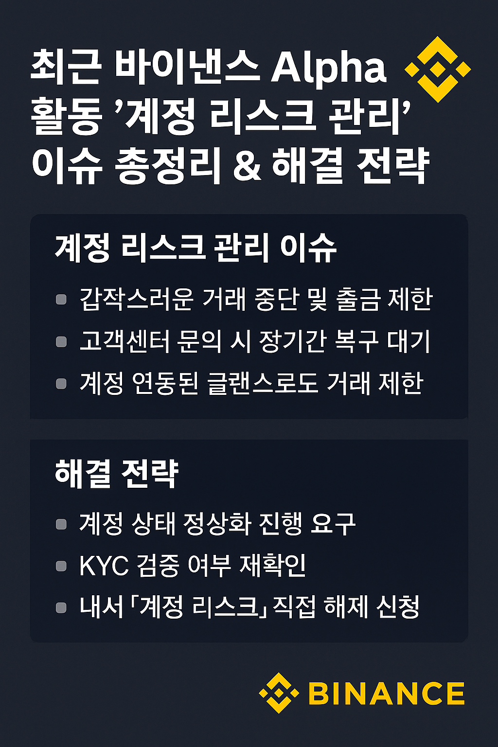최근 커뮤니티 곳곳에서 “Alpha 활동하다가 계정이 막혔다”, “갑자기 리스크 관리(풍차)에 걸렸다”라는 이야기가 많습니다. 단순한 ‘운’의 문제가 아니라, 패턴과 이유가 명확히 존재합니다. 오늘은 이 부분을 정리하면서, 앞으로 Alpha 참여자들이 안전하게 포인트 쌓고, 동시에 바이낸스 혜택을 극대화할 수 있는 방법을 공유합니다.